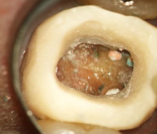 手順としては、破折線内に存在する感染物質をできるだけ除去し、拡大形成後にレジンセメントを流し込み、その後、カットしたグラスファイバーのスリーブ(管)を根管の形状に沿ってしっかり貼り合わせます。