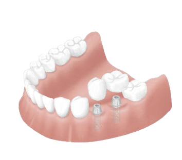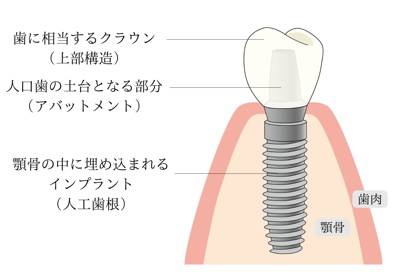 失った歯の歯根の代わりに人工歯根(インプラント体)を埋め込み、その上に人口歯を装着する治療法です。