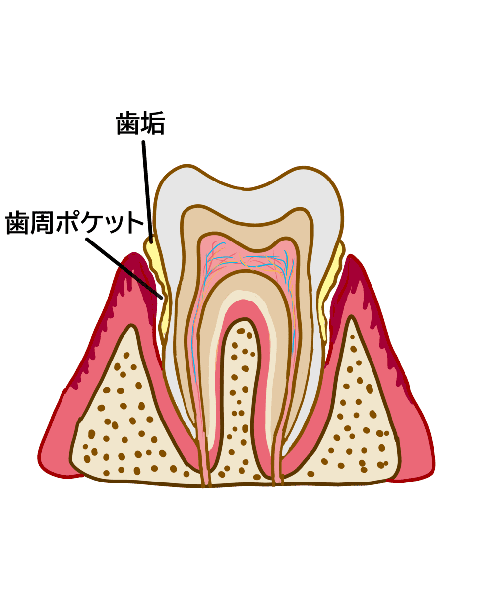 歯周病は、歯周ポケット(歯と歯茎の間の溝)にたまった歯垢が原因で起こる病気です。